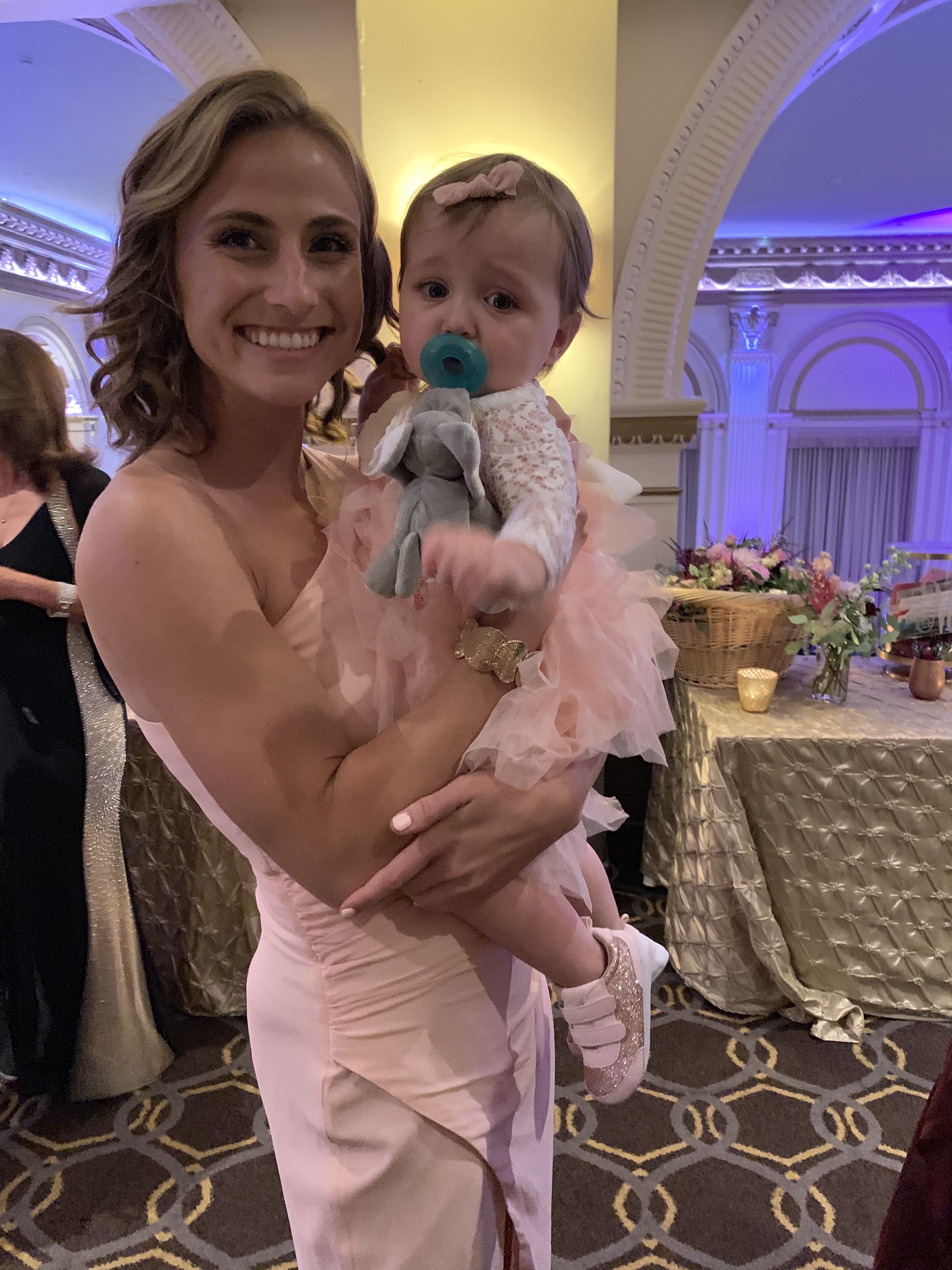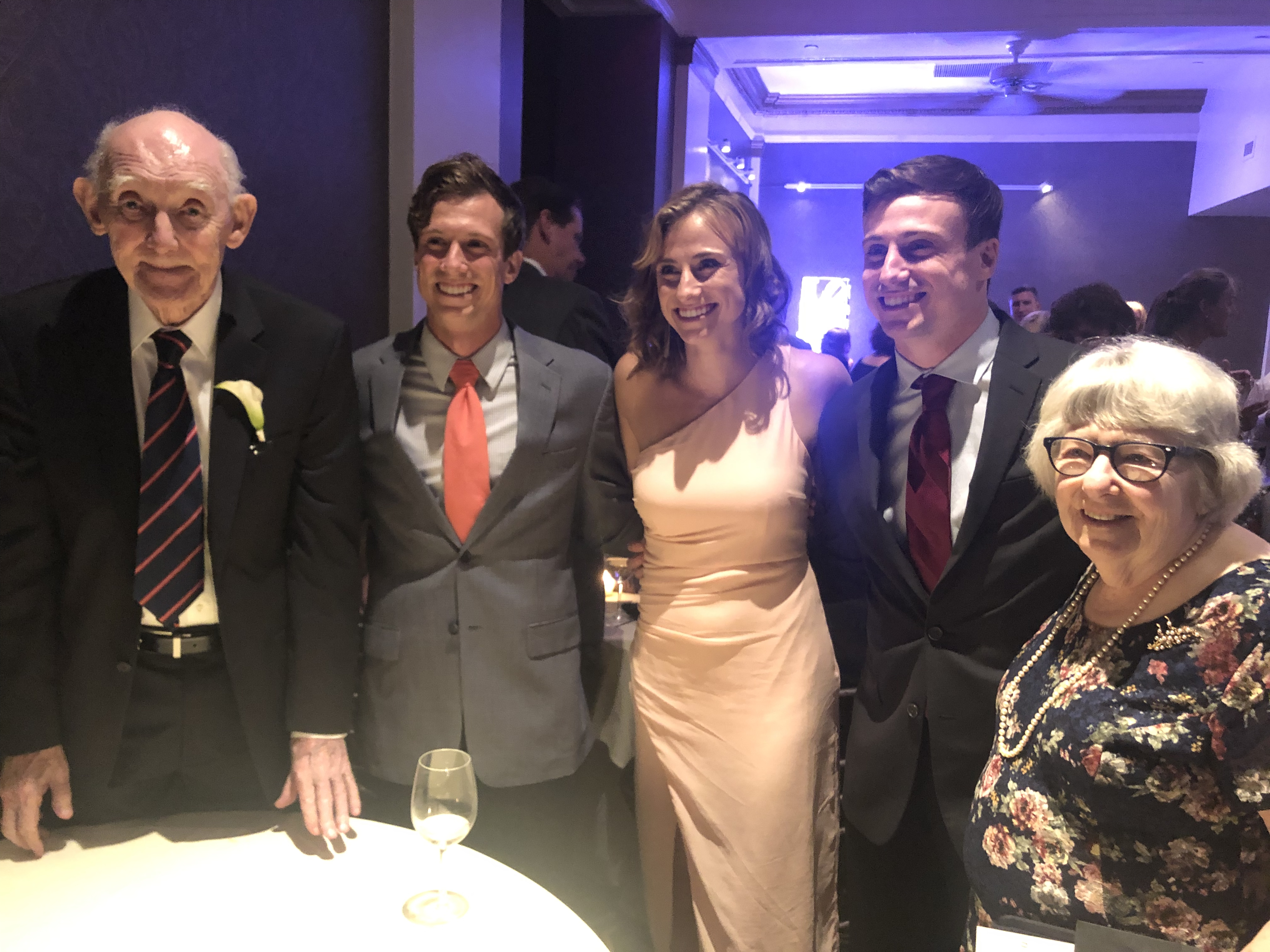 I would describe Teresa’s wedding as tastefully lavish while being totally comfortable. There was no drama, the toasts were thoughtful, entertaining and well spoken. The reception music had broad appeal. The wedding party was elegantly dressed. The venue, the food, the string quartet were special in a good way. Lobster, crab and champagne at the reception cocktail hour and filet for dinner. We had a string quartet during the reception cocktail hour that had a little backbeat or a syncopated jazzy style. It was all hosted at The Ben in downtown Philadelphia, a room featured in the 2018 hit movie Silver Linings dance competition scene. It was a three story vaulted roof beautifully lit with lavender highlights and decorated immaculately.