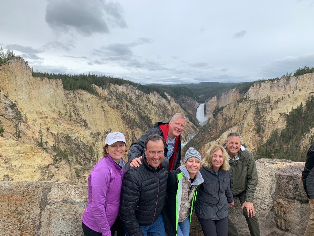 Speaking of bison, our third and final day was spent In a Daydream (Freddie Jones Band) meandering through Yellowstone National Park. Soon after entering the park, we came eye to eye with a big bull bison walking down the road causing a massive traffic jam behind him. While we couldn’t miss a visit to the iconic Old Faithful, we all marveled at the beauty and grandeur of Artist Point, and the Grand Canyon of the Yellowstone. Our newer visitors were surprised and impressed with the piping hot geothermal pools. We saw some of the best Yellowstone had to offer, but all agreed another visit would definitely be in our future. We headed back to Big Sky and decided to finish our trip at the Gallitin Riverhouse Grill where they serve the best $7 chicken. Jim was the only one who got the chicken . . . again.
